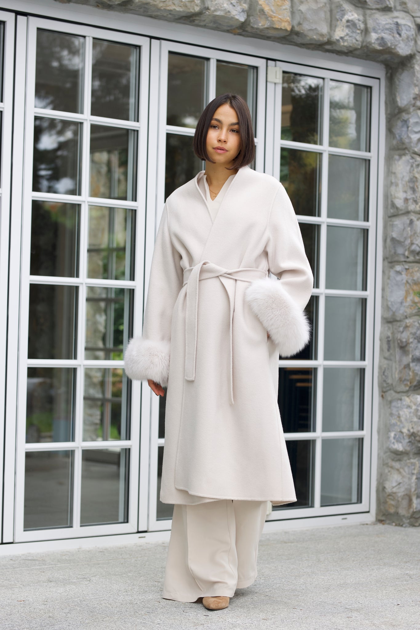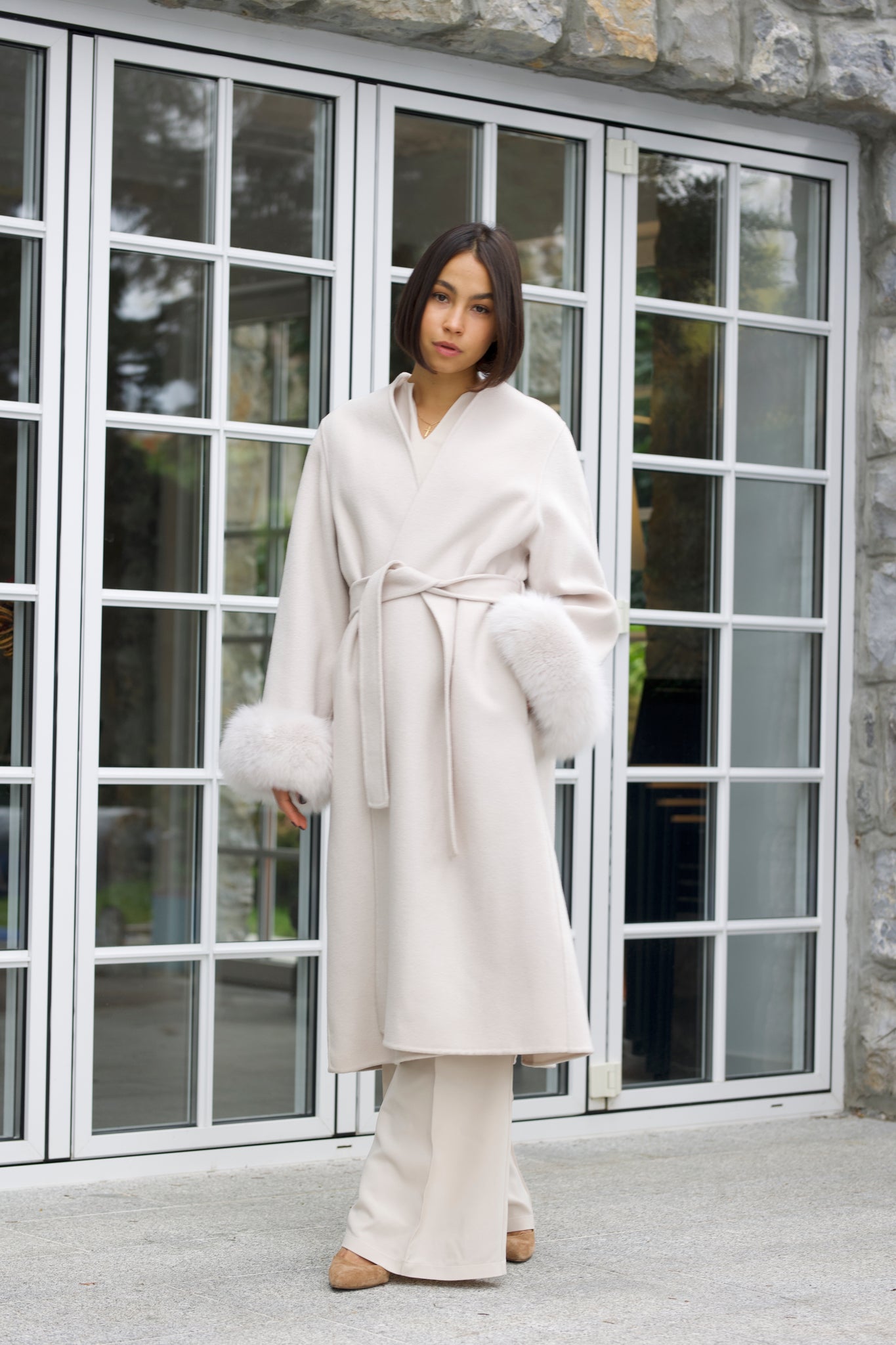 SOPHIA wool-cashmere coat – luxury women’s winter coat crafted from a premium 70% wool and 30% cashmere blend. Long elegant silhouette with faux-fur cuffs, open front, and belt. Minimalist, timeless, and inspired by Max Mara aesthetics — the perfect investment coat for refined winter style.