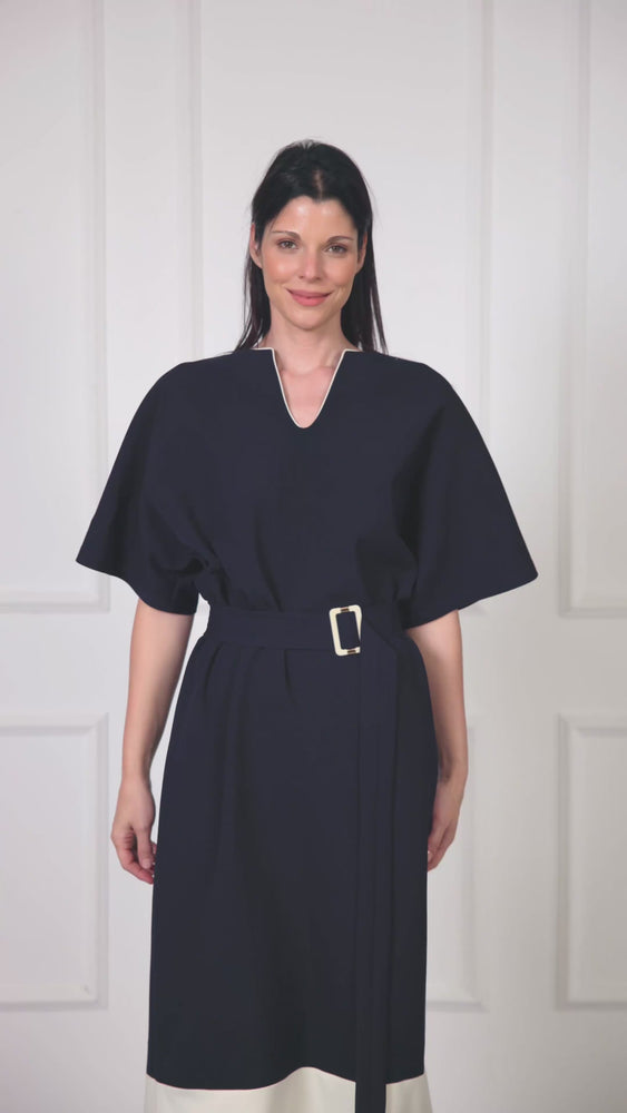 Model ravnih linija u kontrastnom duo-koloru, sa modernim V-izrezom i kaišem koji oblikuje siluetu ili se nosi potpuno opušteno – u zavisnosti od raspoloženja. Napravljena od kvalitetne mešavine viskoze, ova haljina pruža lakoću pokreta i udobnost tokom celog dana.