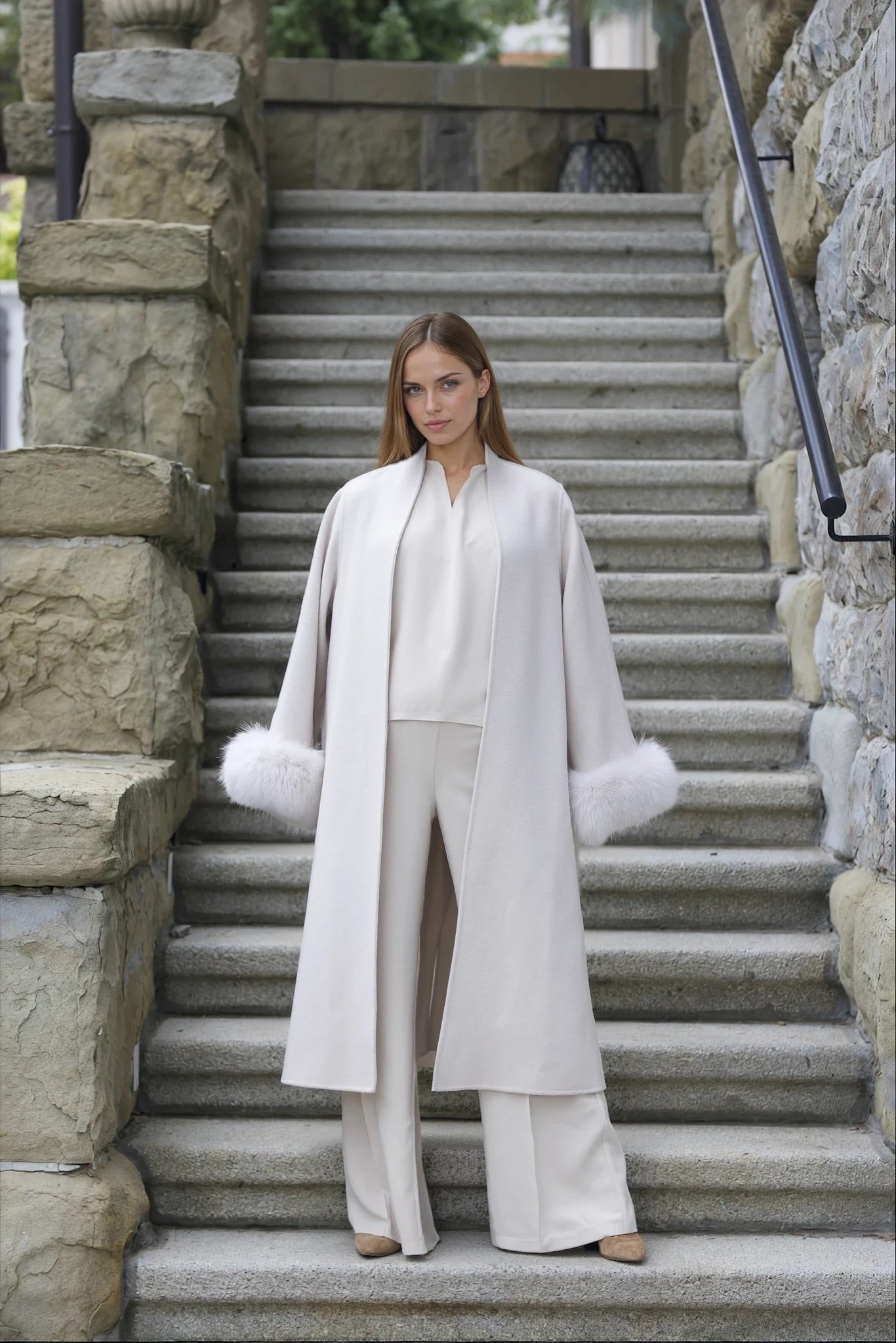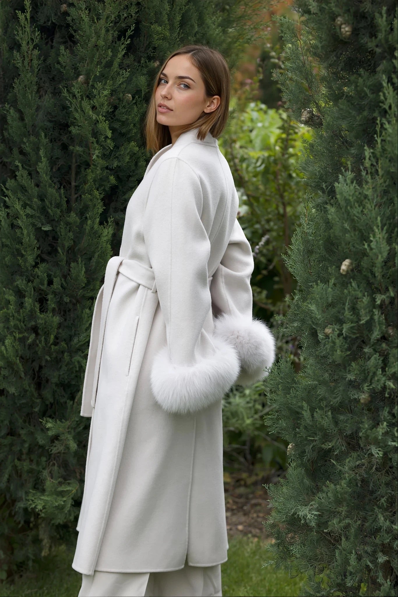 SOPHIA wool-cashmere coat – luxury women’s winter coat crafted from a premium 70% wool and 30% cashmere blend. Long elegant silhouette with faux-fur cuffs, open front, and belt. Minimalist, timeless, and inspired by Max Mara aesthetics — the perfect investment coat for refined winter style.