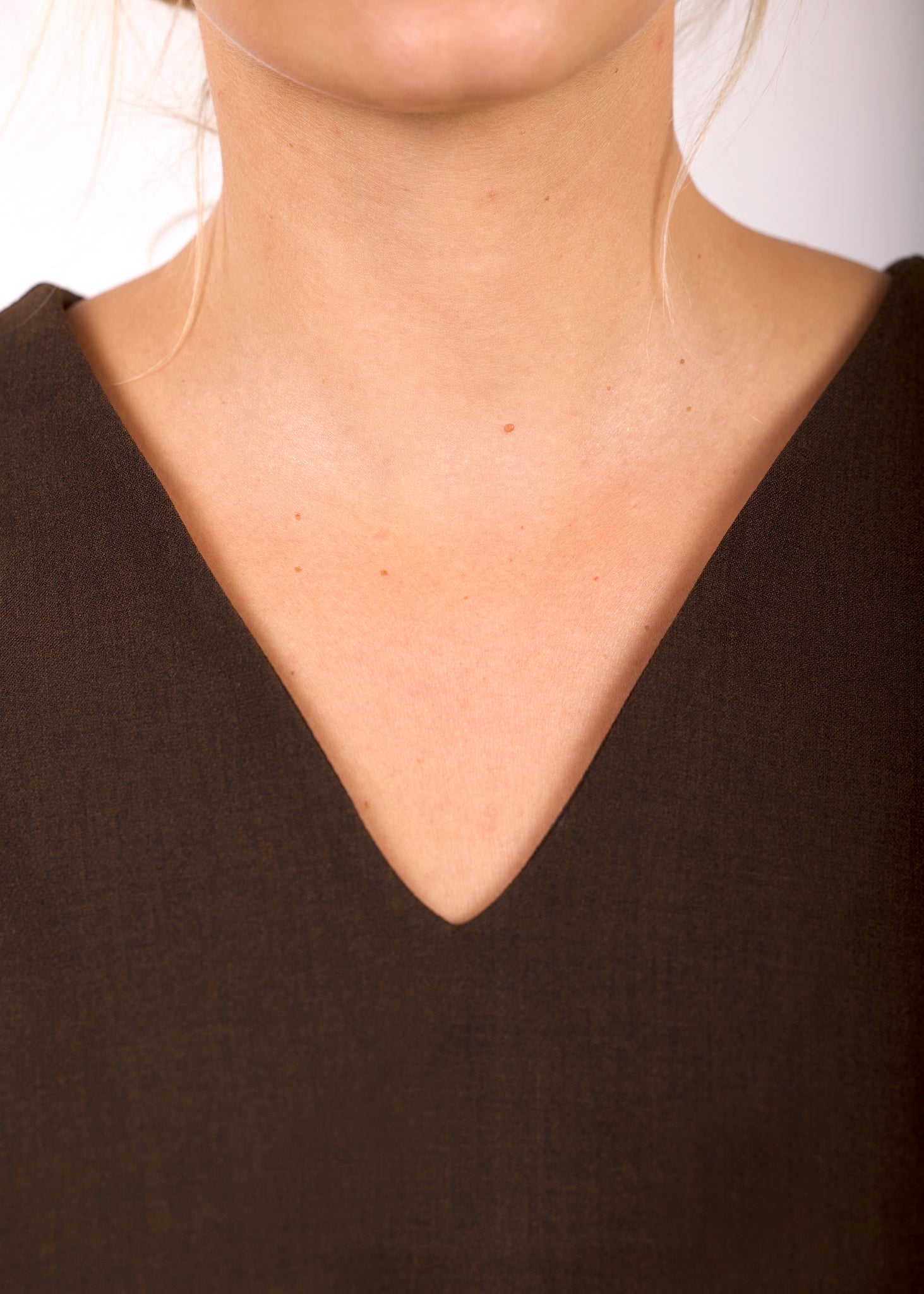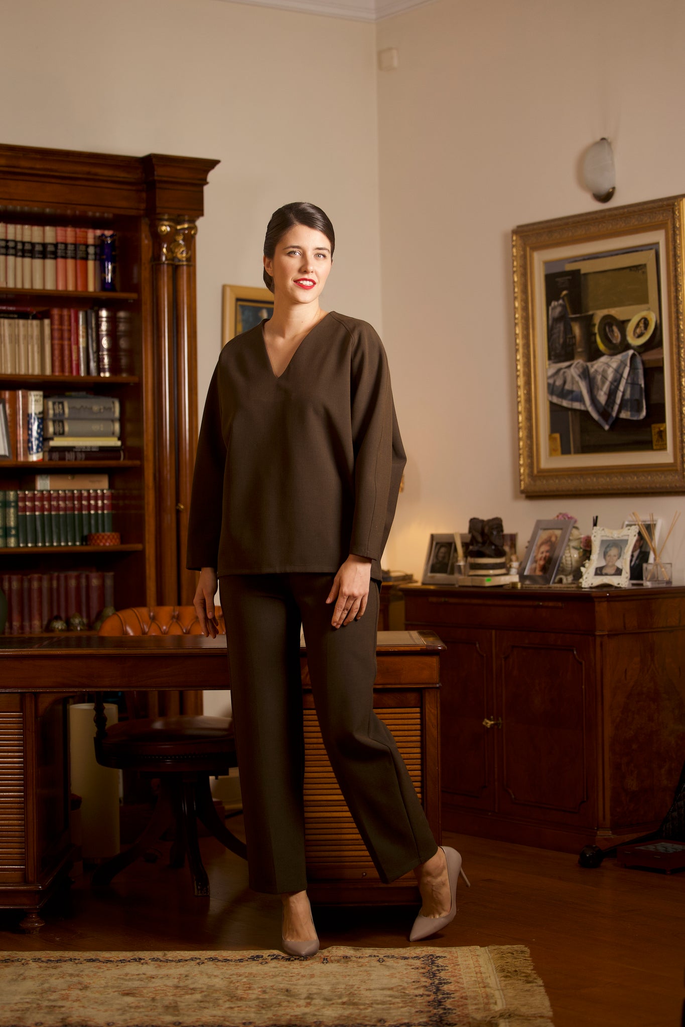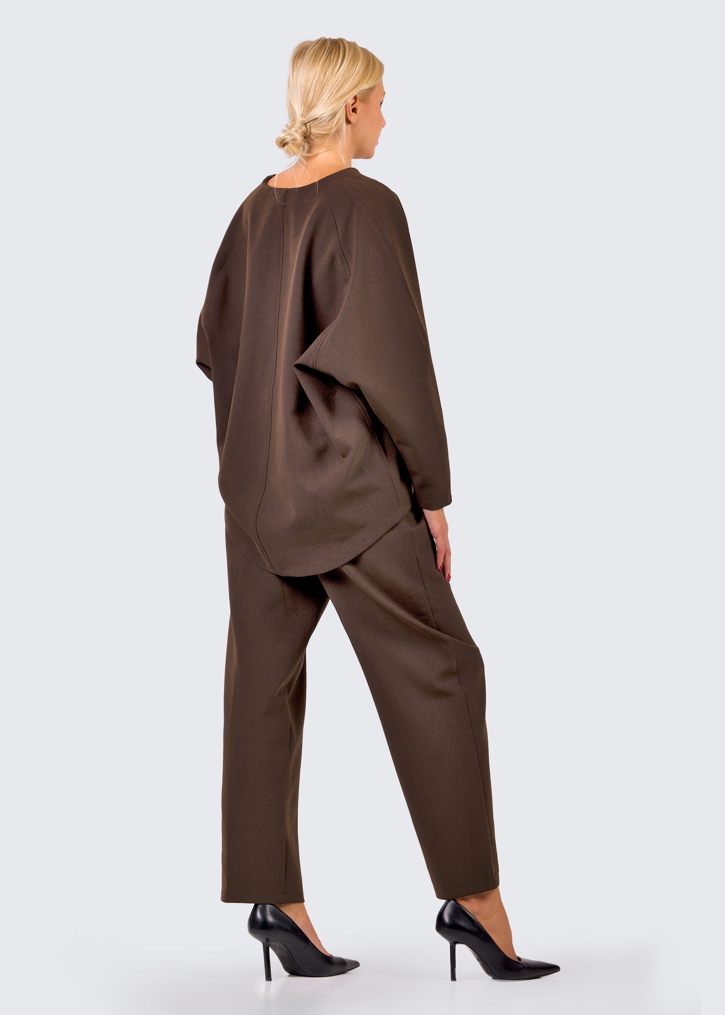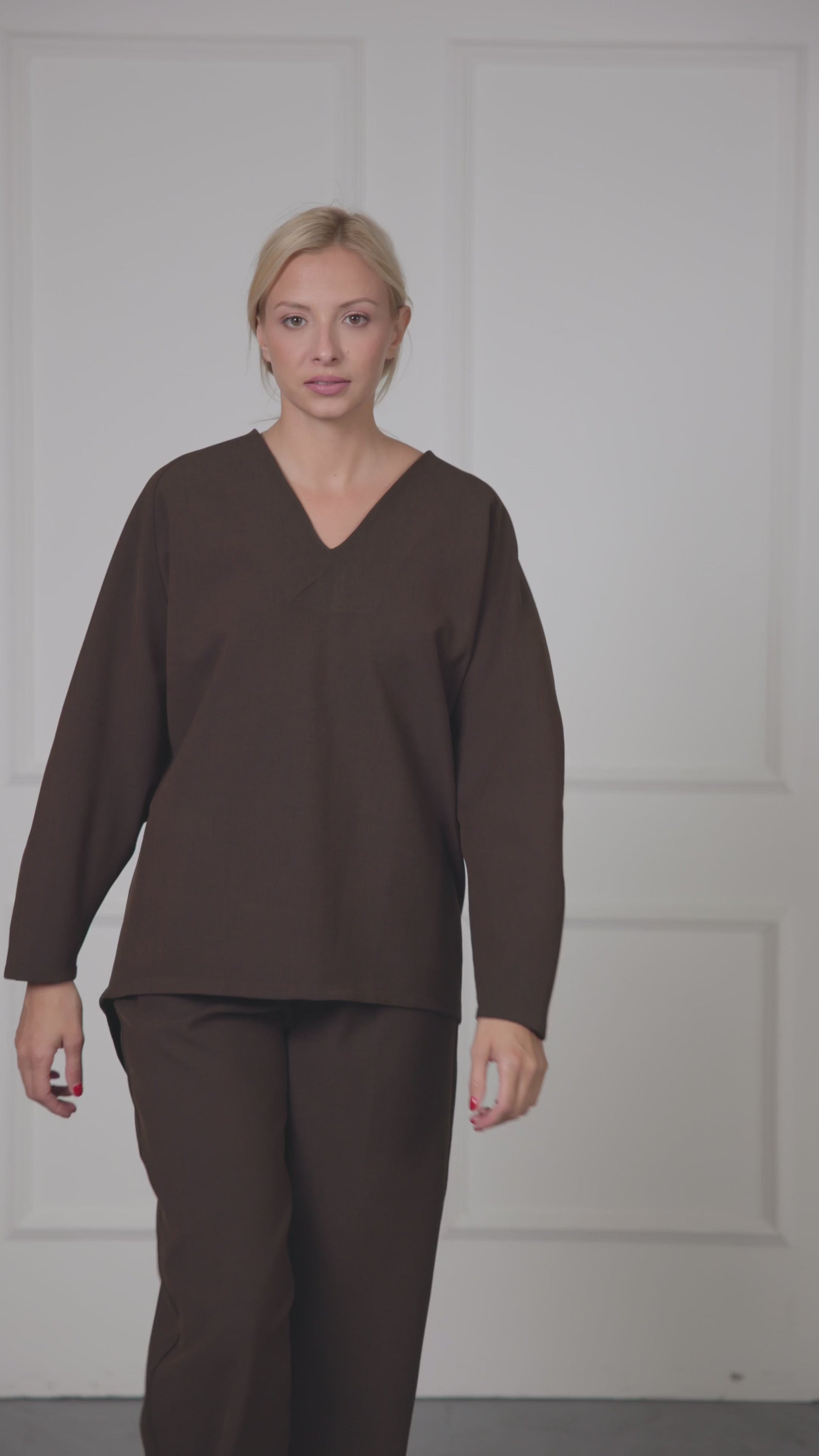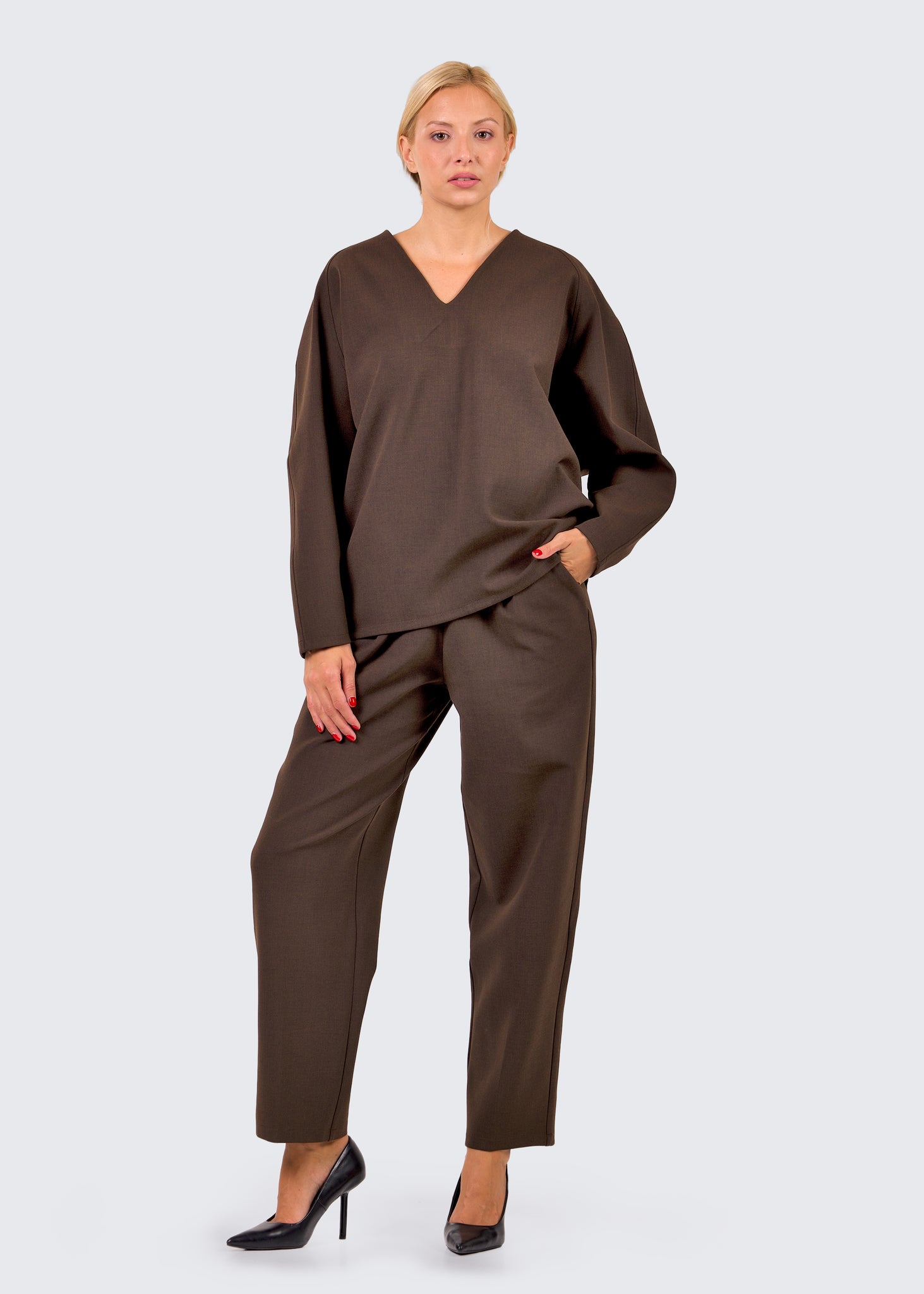 ETERNA top je savremeni simbol moći i minimalizma. Izrađen od luksuzne mešavine viskoze i vune, pruža prijatan osećaj na koži i izuzetnu formu koja drži siluetu. V-okovratnik vizuelno izdužuje vrat, dok geometrijske dekorativne linije na rukavima unose moderan, arhitektonski momenat. Blago spušten zadnji deo dodaje dinamiku i optički produžava figuru, čineći ovaj komad idealnim i za poslovne i za večernje prilike.
